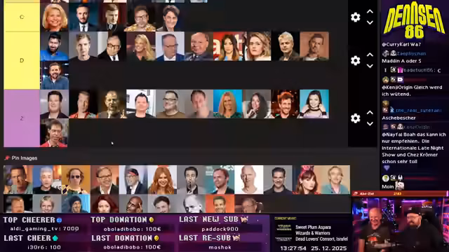 01:23:18Die Bewertungen gehen weiter mit Rudi Carrell (S-Tier), Markus Krebs (B-Tier) und Michelle Hunziger (Z-Tier). Es kommt zu Uneinigkeit über Böhmermann (C-Tier) und Felix Lobrecht (unbewertet). Max Giermann wird für seine Parodien hoch gelobt (S-Tier), während Barbara Schöneberger polarisiert. Die Diskussion intensiviert sich um Kultfiguren wie Heinz Erhard und Bernhard Hoëcker, wobei letztgenannter als A-Tier eingestuft wird.