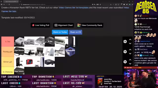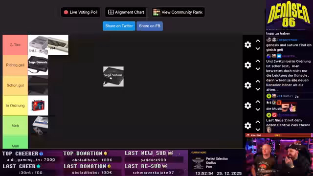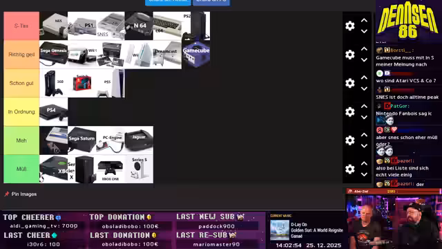 02:00:00Nach der Comedian-Liste wechselt das Thema zu Videospielkonsolen. Zuerst wird kurz über Kinderserien und Pizza-Toppings diskutiert, bevor der Fokus auf Retro-Konsolen gelegt wird. Die Teilnehmer entscheiden, ein Konsolen-Ranking zu erstellen und bewerten alte Hardware wie Commodore 64 und Sega Saturn. Es wird betont, dass Bewertungen auf persönlicher Erfahrung und historischer Bedeutung basieren sollen.