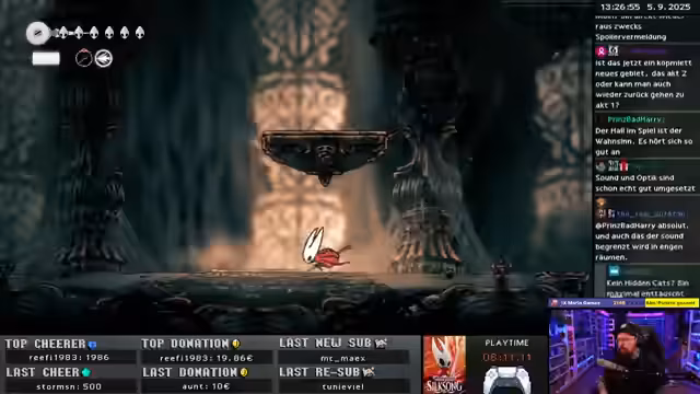 00:16:12Nach einer kurzen Unterbrechung kehrt der Streamer zu Hollow Knight zurück und befindet sich im Gebiet der Zitadelle. Er konzentriert sich auf die Haupthandlung, wie das Erläuten der Glocken und das Füllen des Journals. Während des Spielens kritisiert er das Spiel stark, insbesondere die mangelnde Anzahl an Bänken und die komplizierte Währung mit den Perlen. Dies führt dazu, dass er Ressourcen nicht aktivieren kann und nach Toden oft bei null startet, was er als großen Minuspunkt und unfair empfindet.