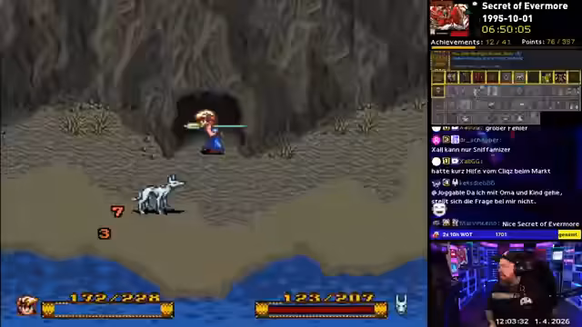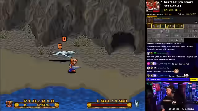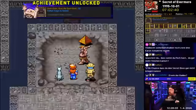 02:39:07Der Streamer tritt gegen einen Roboter-Boss, der sein „böses Ich“ darstellt, und besiegt ihn mit Hilfe seines Hundes. Anschließend wird er von einem Charakter namens Erwin informiert, dass eine Explosion einen Tunnel freigelegt hat, der zu neuen, unerforschten Gebieten führt. Mit Hilfe eines Lebenszepters und weiteren Vorbereitungen, wie dem Kauf von Charon-Amuletten, macht er sich auf den Weg, die Geschichte fortzusetzen und den nächsten Abschnitt von Evermore zu erkunden.