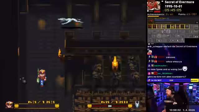 00:17:17Der Streamer legt seine Pläne für einen 100%-Durchgang von Secret of Evermore offen und nennt die wichtigsten „Missables“, also verpassbare Inhalte wie spezielle Items und Questen. Er gesteht ein, dass ein Guide notwendig ist, um nicht Inhalte zu verpassen, und erwähnt spezifische Herausforderungen wie den Tausch der „Armor Polish“ auf dem Markt. Der Hund als Begleiter wird als besonders mächtig beschrieben, was das Spiel verändert und vereinfacht, auch wenn bestimmte Dungeons wie die Pyramide als extrem verwirrend gelten.