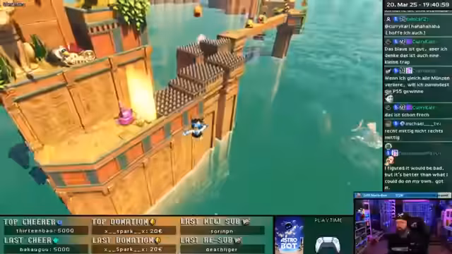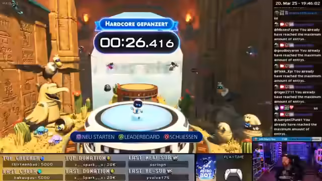 02:58:57Der Stream wechselt zum Spiel Astro Bot, wo er an einem Speedrun-Level teilnimmt. Es wird eine Kooperation mit Sony erwähnt, da dies ein gesponsorter Stream ist. Die Speedrun-Community hat 188.000 Teilnehmer, und der Streamer ist mit Platz 66 noch in den Top 100. Ein strategischer Skip zur Zeitersparnis wird intensiv geübt, um eine bessere Platzierung zu erreichen.