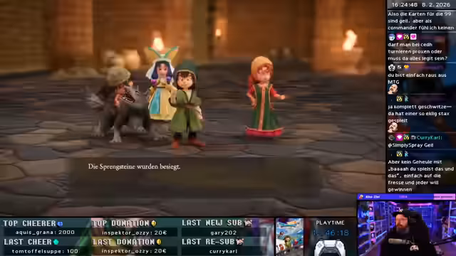 04:12:16Nach dem Abschluss des Yoshi-Levels wechselt der Streamer zu Dragon Quest XI. Er äußert seine Vorfreude auf das Spiel und hofft, endlich die Berufe nach vielen Spielstunden zu erhalten. Der Start des Spiels wird begleitet von kurzen Pausen und technischen Vorbereitungen, gefolgt von der ersten Konfrontation mit dem Erzähler, der die Geschichte der Abtei und der Gefangenschaft von Clara beleuchtet.
