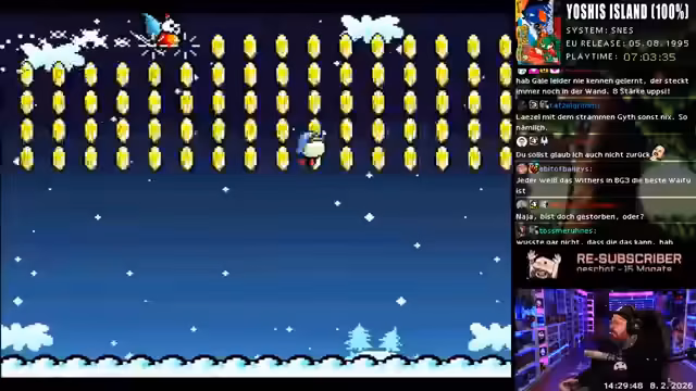 00:00:01Der Stream beginnt mit der intensiven Jagd nach dem 100%-Completion in Yoshi's Island. Der Streamer konzentriert sich darauf, alle roten Münzen und Blumen in den Leveln zu finden, was sich aufgrund der schlecht erkennbaren Münzen und teilweise umständlicher Level-Designs als äußerst frustrierend erweist. Nach mehrmaligen Versuchen in einem Level stellt er fest, dass ihm eine rote Münze fehlt, was einen Neustart und erneutes Durchspielen des Levels erfordert. Neben den spielerischen Herausforderungen gibt es auch technische Probleme, wie das Ausgehen des Lichts und Flackern des Bildschirms, was die Performance zusätzlich beeinträchtigt und den Streamer verärgert.