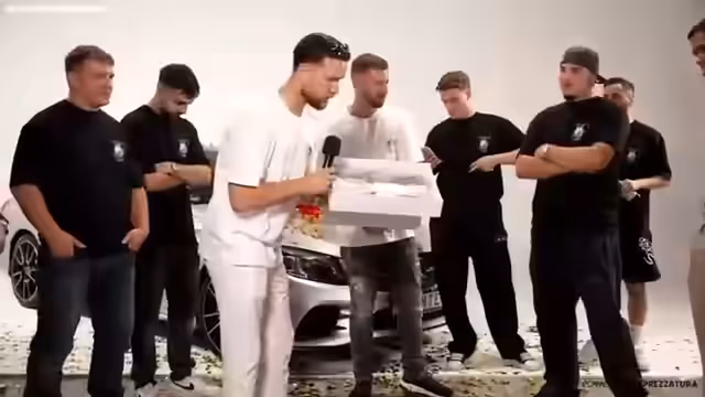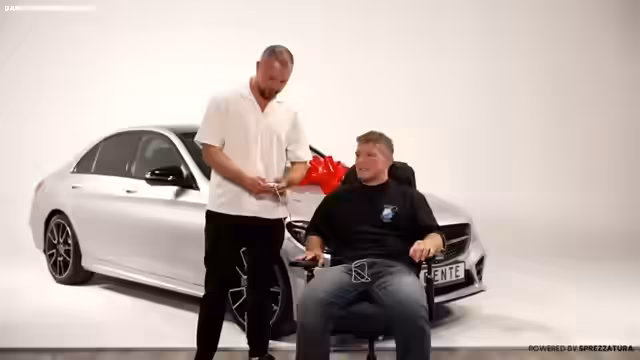 01:48:05Der Höhepunkt des Streams ist die Verlosung eines Mercedes C300 im Wert von 25.000 Euro. Der Streamer erklärt, dass der Gewinner nur durch eine Bestellung bei seinem Gents-Dance-Shop automatisch teilnimmt. Kurz vor der Auslosung wird noch ein 40%-Gutschein für den Shop eingeblendet, um die letzten Bestellungen zu fördern.
