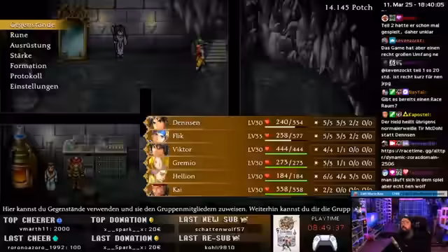 03:34:35Der Streamer setzt sein Spiel in Suikoden fort und befindet sich in einer Mission zur Rekrutierung weiterer Parteimitglieder. Er sucht nach wichtigen Charakteren wie Tesla alias Albert und strebt an, einen Runenladen in seiner Basis zu etablieren. Bei der Rekrutierung stößt er auf unterschiedliche Charaktere, darunter eine Tänzerin namens Mina und eine Runenverkäuferin, und ist bestrebt, seine Truppe durch Verteilung von Ausrüstung und Megamedizin zu stärken. Er erkundet auch neue Städte, um seine Ziele zu erreichen und fortgeschrittene Runen zu sammeln.