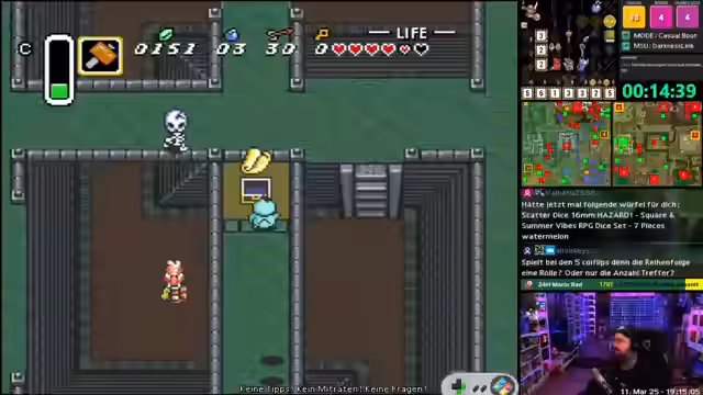 03:59:30Nach Abschluss der aktuellen Spielabschnitte in Suikoden startet der Streamer in den Zelda ALTTPR Community Race im Modus 'Casual Boots'. Der Modus wird als der beste beschrieben und verspricht eine chaotische, randomisierte Erfahrung. Der Streamer beginnt mit der Erkundung der Easten Klippen, stößt aber schnell auf logische Schwierigkeiten und merkt an, dass der Verlauf des Seeds ihn bereits stark eingeschränkt hat und ihm keine logischen Fortschritte mehr ermöglicht.