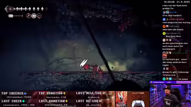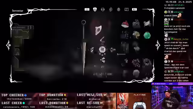05:12:05Es wird überlegt, Silksong nicht mehr so häufig zu spielen, um Spoiler zu vermeiden, obwohl Interesse an einem Race besteht. Der Streamer hat gerade erst mit dem dritten Akt begonnen und überlegt, das Spiel aus dem Titel zu nehmen. Es wird diskutiert, wie viel Zeit noch in das Spiel investiert werden müsste, um alle Bosse zu machen, und ob sich der Aufwand lohnt. Der aktuelle Spieldurchgang wird als etwas enttäuschend empfunden. Es wird erwähnt, dass viele Spieler sich ein Race wünschen würden, aber der Streamer möchte einen Cut machen, da das Spiel viele Spoiler enthält. Es wird überlegt, wie man am besten zu bestimmten Orten im Spiel gelangt und ob es Hinweise im Spiel gibt, die einem dorthin führen. Es wird ein kleiner Drink geholt und die Frage aufgeworfen, ob es sich lohnt, die Bosse zu spielen oder ob sie nur mit einem langen Gauntlet verbunden sind. Es wird überlegt, ob es noch coole Bosse gibt, die man spielen kann, oder ob es immer mit einem 5-Stunden-Gauntlet verbunden ist.