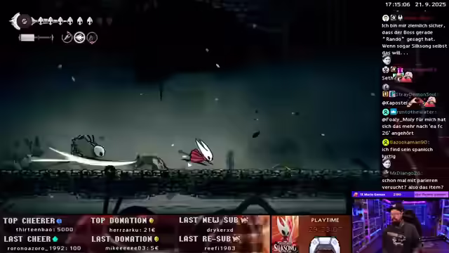 03:17:52Der Streamer bereitet sich auf den letzten Akt von Silksong vor und spricht mit einem NPC, um die Falle vorzubereiten. Er gibt Seide und Krallen für den Bau und macht sich auf den Weg, um das schwere Ding anzubringen. Der Streamer ist bereit für den Bosskampf und hat heilende Vorräte. Er kämpft gegen die große Mutter Seide und fängt sie mit der Seidenschlinge. Es wird eine neue Aufgabe freigeschaltet: Entdecke Valums Schicksal. Der Streamer erkundet ein neues Gebiet und nimmt Schaden durch heißen Dampf. Er trifft auf die rote Jungfrau, die ihm von der Zerstörung und den schwarzen Fäden erzählt. Der Streamer muss mit dem alten Aufpasser reden und sich auf den Weg machen, um ihn zu finden. Der Weg führt in den Knochengrund, und der Streamer muss den Zug und den Aufzug finden. Es wird festgestellt, dass sich alles verändert hat und überall Fäden sind. Der Streamer hat wenig Lust, nach unten zu kommen.