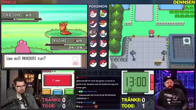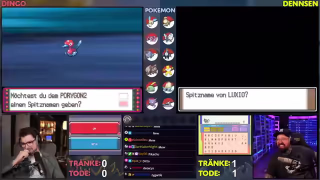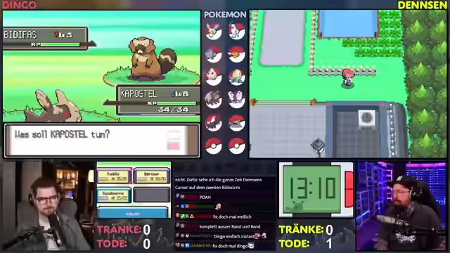 01:01:32Nach anfänglichen Schwierigkeiten erreicht der Streamer endlich die Stadt und freut sich über diesen Erfolg. Es wird über die Anzahl der möglichen Pokémon-Begegnungen in der Stadt diskutiert und der Streamer sucht nach den Clowns, die er für eine Aufgabe benötigt. Es wird überlegt, ob man zuerst die Clowns finden oder die Pokémon-Schule besuchen soll. Der Streamer findet die Angel und macht sich auf den Weg zum Angeln. Es wird überlegt, welche Route man als nächstes nehmen soll und der Streamer versucht, ein Pokémon beim Angeln zu fangen. Nach einigen erfolglosen Versuchen gelingt es ihm schließlich, ein Amoroso zu fangen und gibt ihm den Spitznamen Kapostel. Es stellt sich heraus, dass es Drachenwut gibt und der Saft durch Drachenwut stirbt, was den Streamer frustriert.
