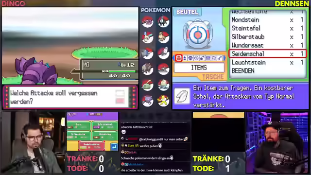 01:35:37Es wird ein Trainer-Fight gestartet, wobei Kapostel viel Schaden macht und als Carry bezeichnet wird. Es werden verschiedene Pokémon-Attacken und -Fähigkeiten diskutiert, sowie die Schwierigkeit, bestimmte Pokémon zu leveln. Es wird überlegt, welches Item man für welchen Zweck nutzen kann, z.B. die Uhr oder den Schrittzähler. Es wird festgestellt, dass sich ein Trainer bewegt, was ungewöhnlich ist. Kapostel wird weiterhin als stark hervorgehoben. Es wird ein Mondstein gefunden und überlegt, ob man noch durch eine Höhle muss. Es wird ein Heil-Item namens Seegesang gefunden. Es wird eine Steintafel gefunden und überlegt, wo noch Items zu finden sind. Es wird ein Knogger gefangen, worüber sich gefreut wird. Es wird diskutiert, welches Pokémon aus dem Team entfernt werden soll, wobei Juro als Kandidat genannt wird. Es wird ein Taubsi gefangen und überlegt, wer dafür aus dem Team weichen muss. Es wird beschlossen, Akne Kai für Taupsimus zu entfernen. Es wird ein Piondragi gefangen und Mo genannt. Es wird überlegt, welches Pokémon als nächstes ausgetauscht werden soll, wobei Akne Kai oder Absol zur Debatte stehen.