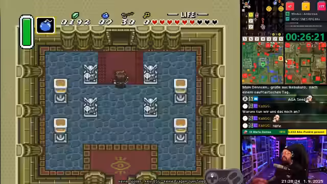 05:16:33Nach dem intensiven Theaterhythm-Teil bereitet sich der Streamer auf den eigentlichen Hauptinhalt des Streams vor: einen Zelda: A Link to the Past Randomizer-Run. Er äußert Bedenken bezüglich der Technik, da die Auflösung seines Bildschirms während des OBS-Laufs verändert wurde, was jedoch problemlos funktionierte. Ein Frustrationspunkt ist das manuelle Umbenennen von Aufzeichnungsdateien, da ein automatisches Überschreiben nicht möglich ist. Der Streamer beklagt auch die Performance von Amiibo-Geräten im Vergleich zu kontaktlosen Zahlungssystemen. Nach einer kurzen Pause startet der Run.