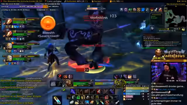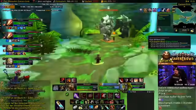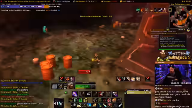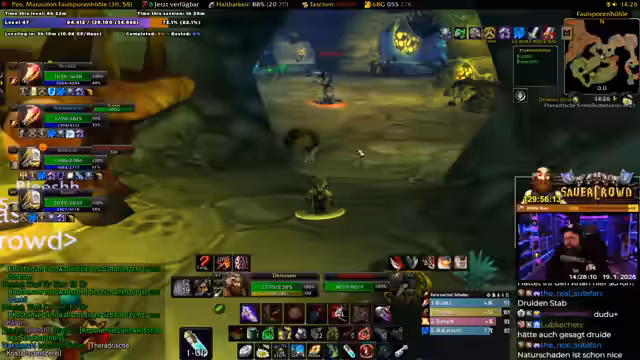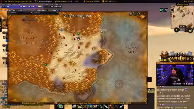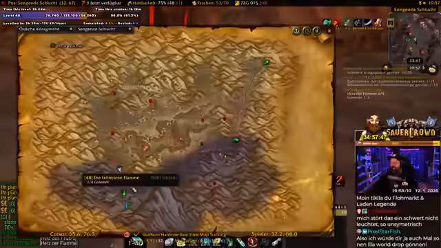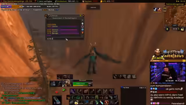 00:39:11Die Gruppe ist im Desolace, dem Gebiet vor dem Maraudon-Dungeon, unterwegs und sucht nach den benötigten Quests. Es gibt Verwirrung über die Position von NPC und Questgebern. Der Streamer liest im Chat vor, dass es drei 'Khans' (Elite-Bosse) gibt, die außerhalb des Dungeons getötet und deren Edelsteine ('Gems') gesammelt werden müssen. Zwei davon befinden sich vor dem Dungeon, zwei weitere in jedem der farblichen Flügel (lila/Orange) des Dungeons selbst. Die Gruppe muss sich entscheiden, welchen Pfad sie zuerst nehmen (lila oder Orange), um alle Quests abzuschließen. Gleichzeitig sucht er nach dem 'Sandstormen' für die Buff-Quest und versucht, sich mit dem Krieger-Tank 'Kroko' über 'Tree-Lover', einen angeblich unzuverlässigen Spieler, auszutauschen, was humorvoll und als Community-Ratschlag dient. Die Koordination ist komplex, da einige Quests nicht teilbar sind und alle Spieler individuell annehmen müssen. Der Streamer bereitet sich vor, indem er 'Devo Aura' skillt und um 'Wasser' (Mana-Regenerationsgetränk) von den Magiern der Gruppe bittet.