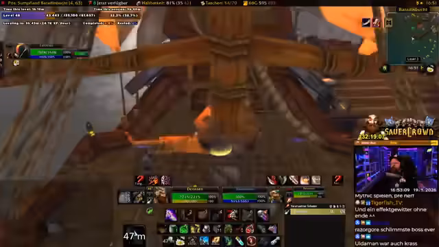 05:02:46Der Streamer diskutiert in World of Warcraft die Reisemöglichkeiten mit dem Schiff nach Manitill und überlegt, ob dies langsamer ist als andere Optionen. Er erwägt, Quests in diesem Gebiet anzunehmen, während er die aktuelle Spielumgebung und Gegner berücksichtigt, um effiziente Fortschritte zu erzielen. Die Entscheidung basiert auf Zeitmanagement und strategischer Planung für das Leveln.