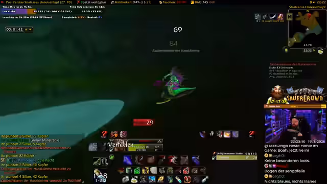 09:17:07Der Streamer startet einen Timer, um die Erfahrungsrate in einer Höhle zu messen. Nach 10 Minuten hat er etwa 7.500 EP gesammelt, was auf eine theoretische Rate von etwa 75.000 EP pro Stunde hindeutet. Er bewertet dies als sehr lukrativ, besonders mit World Buffs, merkt aber an, dass das Grinden ohne Beute (Loot) sehr langweilig und monoton sein kann.