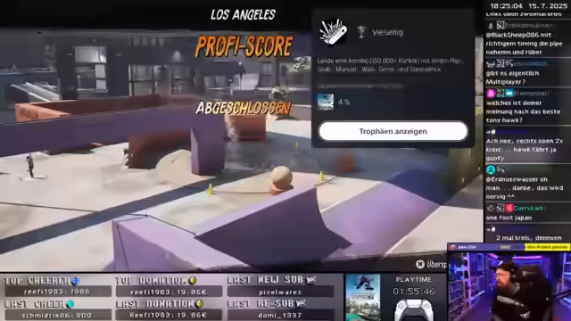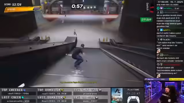 01:29:51Im Level 'Vorstadt' fehlen dem Streamer noch einige Objekte wie Kürbisse und ein Skillpunkt, die er mit Hilfe der Zuschauer sucht. Anschließend startet er im 'Flughafen'-Level, wo er Aufgaben wie 'Airwolf über die Rolltreppe', 'Suche zehn Länder' und 'Bringe Skate-Buddy die Tickets' bewältigen muss. Das Herausfinden des versteckten Tapes gestaltet sich dabei als besonders tricky.