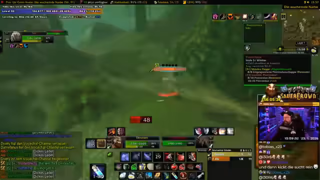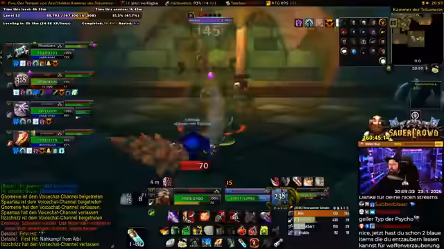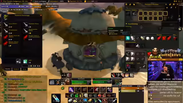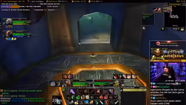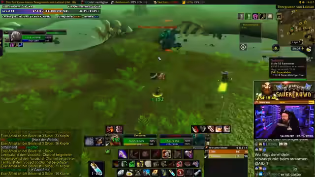 04:06:56Der Streamer stößt auf ein seltenes Item, das in der Gilde gebraucht werden könnte. Er überlegt, ob er es der Gildenleitung für ein späteres Item-Roll übergibt oder direkt im Chat fragt, ob jemand es benötigt. Gleichzeitig ist sein Questfortschritt bei über 30 %, und er erhält die Nachricht von einem Bug in der Gilden-Questübergabe. Es wird eine Konversation über die Bedürfnisse eines Feuer-Mages in der Gilde geführt, der ebenfalls Dual-Spec und epische Ausrüstung besitzt.