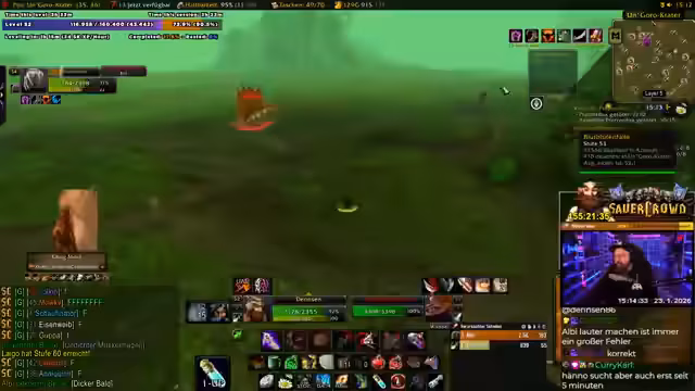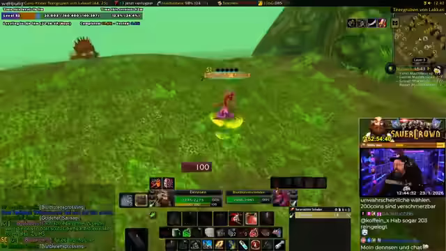 09:36:16Nach einem weniger reibungslosen Bosskampf, bei dem das Haustier (Voidwalker) seine Spott-Funktion nicht wie erwartet erfüllte, wird im Chat die Mechanik erklärt. Ein Zuschauer klärt auf, dass der Haustier-Spott kein eigentlicher Spott ist, sondern nur für den Akkuaufbau dient. Danach geht die Gruppe zu einer Schale, um eine abgelehnte Quest abzuschließen. Durch das Auslooten eines Mobs können sie ein weiteres Quest-Item erhalten und damit zusätzliche Fett-EP sowie einen Schmuckstücke als Belohnung sammeln. Der Streamer erwähnt, dass man im Notfall den Voidwalker hätte opfern können, und plant, später Verzauberungen für Items herzustellen, sobald das Material vorhanden ist. Die Gruppe beschließt, zu neuen Portalen zu wechseln, um weiterzuleveln.