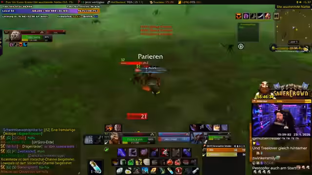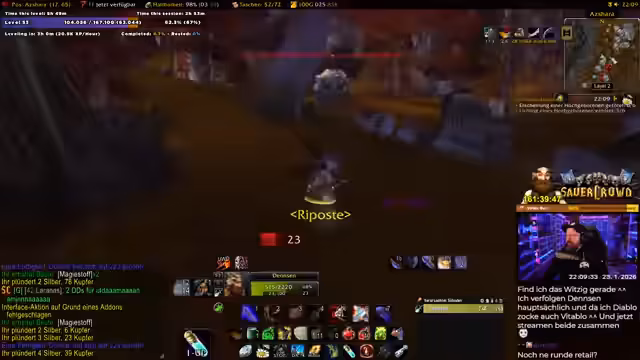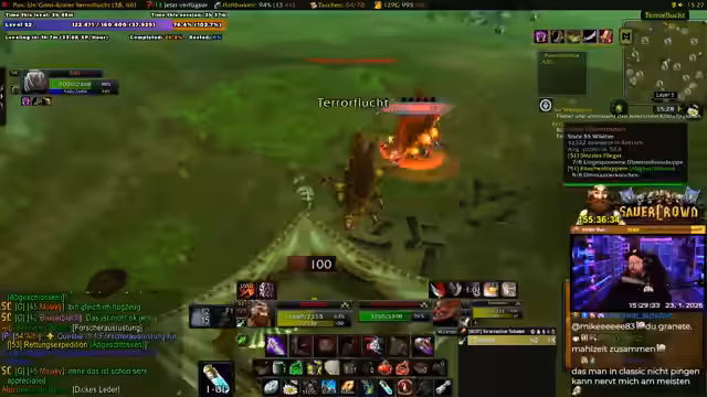 04:02:55Eine hektische Schlacht gegen mehrere Elite-Mobs beginnt, bei der der Streamer und sein Partner strategisch agieren und aufeinander aufpassen müssen, um nicht zu sterben. Sie besprechen ihre Pläne für zukünftige Dungeons wie Blackrock Depths (BRD), Lower Blackrock Spitz (LBS) und Upper Blackrock Spitz (UBS). Dabei klären sie, dass LBS und UBS Schlüssel erfordern, die in der Gilde hergestellt werden müssen. Außerdem diskutieren sie die Verfügbarkeit von Spielern in dieser Levelspanne, die als sehr dünn beschrieben wird.