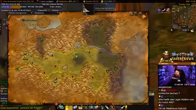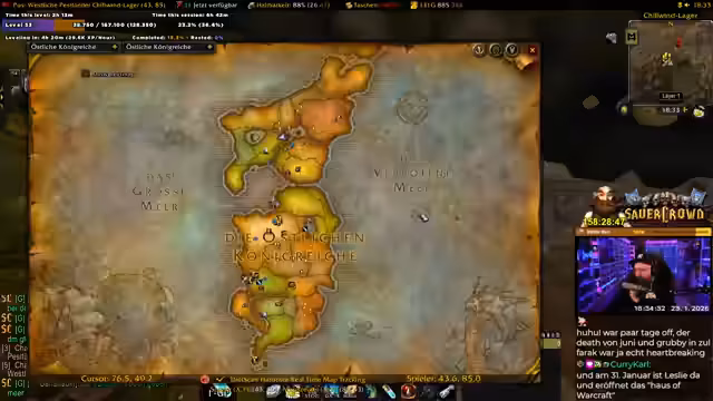 02:36:39Im Stream wird der Fortschritt im Spiel besprochen. Der Streamer befindet sich bei etwa 40 % zum Level 60 und blickt auf die vorherigen, als unangenehm empfundenen Levelbereiche zurück. Zukünftige Zonen wie Winterspring werden als lohnend angesehen, da dort bessere Items droppen. Der ursprüngliche Plan, bis zum nächsten Mittwoch Level 60 zu erreichen, wird als unrealistisch eingeschätzt, da dies eine Spielzeit von anderthalb Stunden pro Tag erfordern würde.