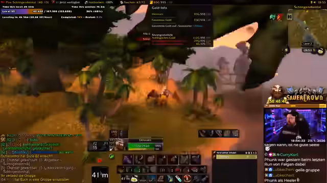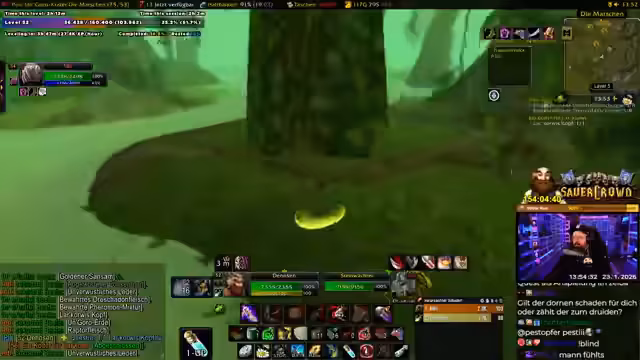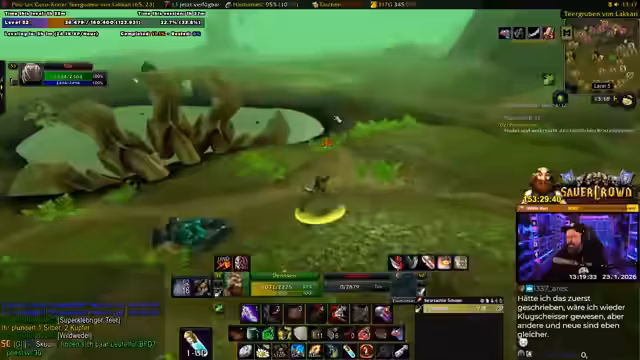 00:28:10Ein anderer Spieler, Albi, tritt ins Spiel und vereinbart mit dem Streamer, fortan gemeinsam zu questen, um das Erreichen von Level 60 zu beschleunigen und den Spaßfaktor zu erhöhen. Sie planen, die Gebiete Un'Goro und Ashara gemeinsam abzuarbeiten. Der Streamer erklärt taktische Details und legt Wert darauf, Albi nicht die Quests vor der Nase wegzunehmen, obwohl gemeinsames Questen effizienter ist. Sie diskutieren auch die Machbarkeit von Dungeons und instanzenähnlichen Gebieten in ihrem Levelbereich und tauschen sich über Builds und Rollen in möglichen Gruppen aus.