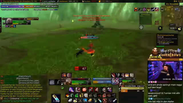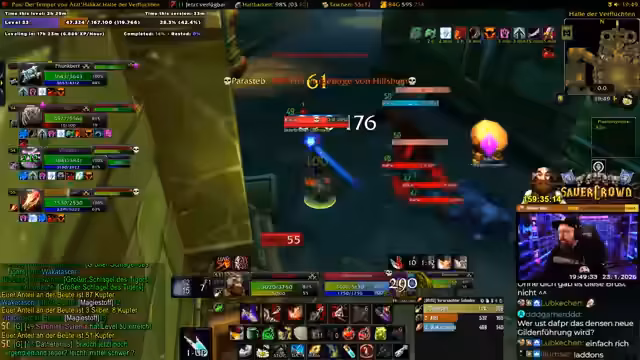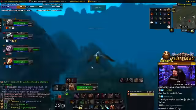 10:10:11Der Streamer baut wieder auf Grinden auf, um das restliche Level zu erreichen. Er wechselt zu einem neuen Spot in der Aschara, wo er sich effizienter Leveln kann. Kurz darauf betritt seine Gruppe, bestehend aus zwei Schurken, zwei Druiden und ihm als Tank, den Dungeon DM-Nord. Das Ziel ist es, durch ständiges Durchziehen und Clearen der Mobs die Ringe für die Gilde zu farmen. Die Zusammenarbeit beschreibt er als reibungslos und sehr effektiv. Der Streamer gibt an, einiges über seine Rolle als Tank gelernt zu haben, da der Endboss seine volle Aufmerksamkeit erforderte und ohne den Heiler-Funk, der den Arsch der Gruppe gerettet hat, schwierig gewesen wäre.