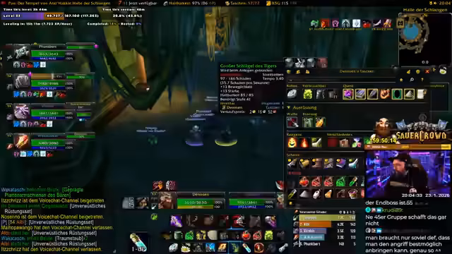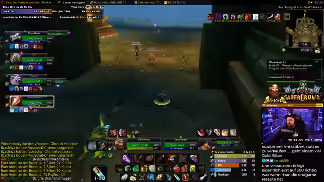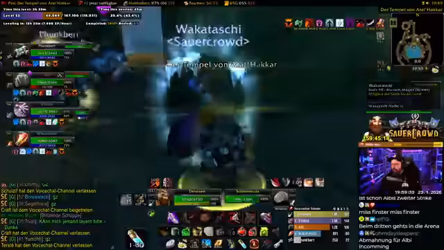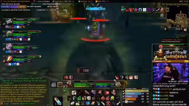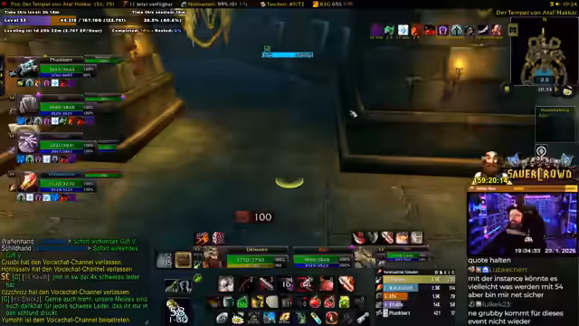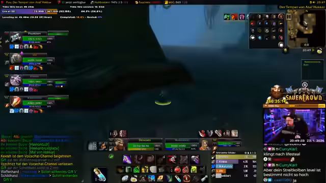07:32:52Der Streamer steuert auf einen Dungeon-Einsatz zu und wartet auf das letzte Gruppenmitglied, Waka. Es wird eine kurze Unterbrechung angedeutet, da er kurz die Toilette aufsuchen muss. Die Gruppe ist bereits vollzählig mit Vitablo, Martin und anderen Spielern, die alle bereit sind. Die Gruppe wird den Tempel von Atal'Hakir erkunden, ein Dungeon, den der Streamer seit über 15 Jahren nicht mehr gespielt hat. Er versichert jedoch, dass er die Leitung übernehmen wird und die Gruppe sicher durchführen wird.