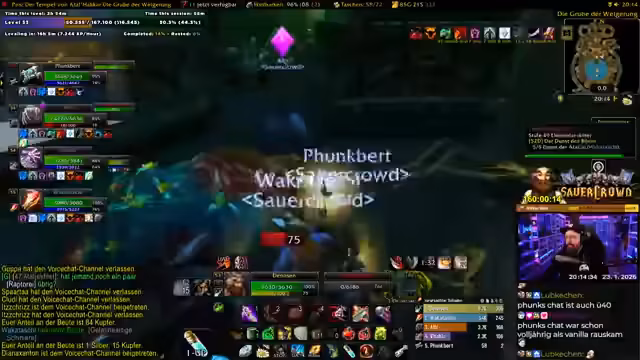 08:16:35Die Gruppe kämpft sich durch die Ebenen des Tempels und stellt dabei fest, dass der Schaden der Gruppe sehr stark ist. Die Mobs und Minibosse sind bislang sehr einfach zu besiegen. Es werden gezielt bestimmte Ziele wie das Sheep-Target kontrolliert. Nach dem Besiegen eines Minibosses werden Gegenstände geöffnet. Dabei wird besonders eine gefundene Warlock-Feder erwähnt, die für einen Quest von Vita wichtig ist. Der Streamer betont, dass er die Items nach Ende des Dungeons erst verteilen wird, um Unstimmigkeiten zu vermeiden.