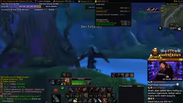 05:37:22Der Streamer kehrt zu World of Warcraft zurück, ist aber weiterhin durch ein unaufgeklärtes technisches Problem mit einer nicht zugestellten E-Mail abgelenkt. Er entschuldigt sich für die lange Pause, die das Gameplay unterbricht, und verweilt im Spiel, um die Quest 'Die Sengende Schlucht' fortzusetzen.