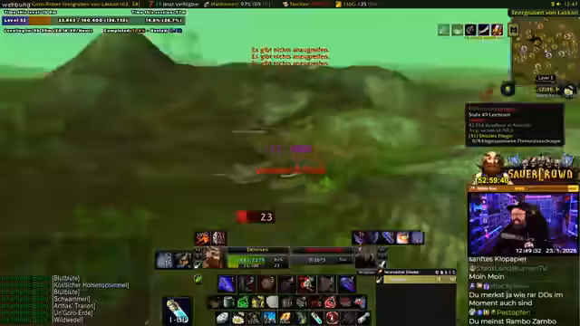 03:47:20Beim weiteren Leveln stößt der Streamer auf eine Situation, in der sein Kamerad mit einem Schlag von einem Elite-Mob auf 0 Lebenspunkte reduziert wird. Er erkundet die Gegebenheiten der Spielwelt und wechselt in ein spezielles Healer-Set. Dabei wird eine Diskussion über einen Retro-Loot-Mechanismus im Spiel ausgelöst, bei dem das Anklicken eines Items im Chatfenster erforderlich ist. Er stellt einen interessanten Schurken-Sound in den Vordergrund und warnt vor einem besonders starken Elite-Mob namens König Morsh, der 61.000 HP besitzt und mit einem Full Team erst nach mehreren Angriffen besiegt werden kann.