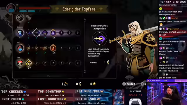 01:39:03Im Fokus des Streams stehen die Combat-Mechaniken, wie Kollisionsschaden, der durch gezielte Angriffe auf mehrere Gegner erhöht wird. Der Streamer erkundet den Skillbaum seines Charakters 'Cider', der u.a. mit einer Mine, die Gegner anlockt, und einem Schuriken-ähnlichen Skill ausgestattet ist. Es gibt diverse Buffs wie die 'Treuekarte' oder 'Mutters Gnade', die zu Beginn des Spiels Vorteile gewähren. Eine zentrale Geschichte rundet das Spielerlebnis ab, die sich um eine KI-Platte und den Scharlachroten Orden dreht, dem der Spieler seit je gejagt wird.