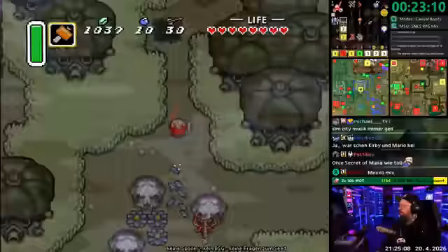 03:10:41Nachdem eine Reihe von Charakteren erstellt und in die Spielwelt integriert wurde, wechselt der Streamer zu einem anderen Spiel für ein Community-Race. Es wird ein Zelda ALTTPR Randomizer gespielt, bei dem der Streamer gegen andere Teilnehmer antritt. Das RACE wird als stressig beschrieben, da es unter Zeitdruck gespielt wird und der Streamer unzufrieden mit seiner Performance ist.