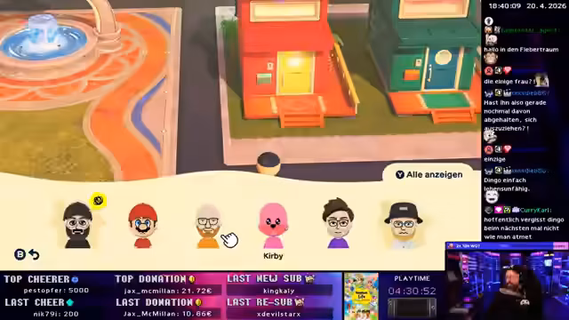 02:23:54Der Streamer erkundet die Spielmechaniken von Tomodachi Life, einschließlich des Erwerbs von Gegenständen, des Level-Aufstiegs der Charaktere und der Gestaltung von Wohnungen. Es werden interaktionen zwischen den Charakteren gezeigt, wie romantische Beziehungen und Freundschaften. Auch die Funktion der Reisegutscheine, die es den Charakteren ermöglichen, zu reisen, wird vorgestellt.