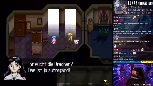00:31:54Nach einer längeren Eröffnungssequenz, die die Geschichte um den Helden Alex, der den Drachenmeister Dain verehrt, erzählt, gelangt der Streamer in die Spielwelt. Er erkundet das Dorf, trifft auf die Charaktere Luna und Nell und erhält die Erlaubnis, das Dorf zu verlassen. Eine Schlüsselszene ist der Besuch bei der Statue von Dain, wo Alex den Entschluss fasst, an der Seite von Rammus in die gefährliche Weißdrachenhöhle aufzubrechen.