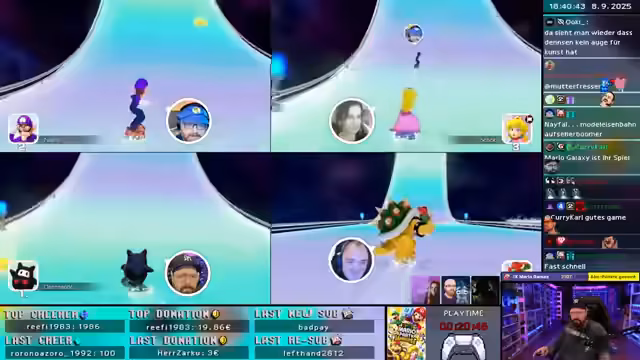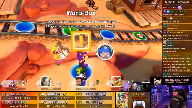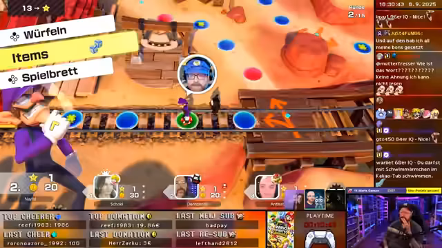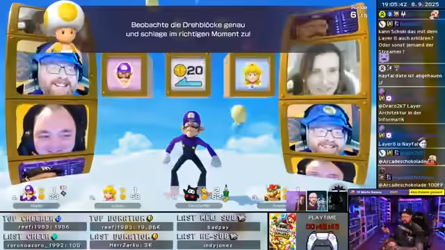 03:20:14Zum Ende der Runde kommt es zum Bowser-Event, bei dem Sterne umverteilt werden. Ein Spieler gibt einen Stern an einen anderen weiter, was als Frechheit empfunden wird. Der Streamer, der zuvor einen Stern verloren hat, gibt nun einen Stern an Navefall, was zu einem ironischen 'Frech, unverstehend' im Chat führt. Die Runde endet mit einem Gesamtsieg des Streamers, der jedoch keinen echten Spaß am Sieg hatte.