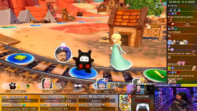 03:57:46Es wird überlegt, ob der Buh ein Gamechanger sein wird, aber ein Spieler kann es sich nicht mehr leisten, Sterne zu stehlen. Ein anderer Spieler fährt rückwärts und kauft eine Goldpipe, was als Panne angesehen wird. Es wird spekuliert, dass die KI den gefährlichsten Spieler identifiziert hat. Es wird ein Minispiel gespielt, bei dem man auswählen muss, was hinter einem Sumpf im Bild ist. Der Bot wird als dumm bezeichnet, weil er eine falsche Antwort gibt. Es wird über Glücksspiel im Spiel diskutiert. Ein Spieler gewinnt ein Minispiel und sagt, dass es an einem Matcha-Getränk lag. Ein Spieler überlegt, in welche Richtung er sich bewegen soll, um zum Shop zu gelangen. Es wird überlegt, ob man zum Buh gehen soll, um Münzen zu stehlen. Ein Spieler kauft einen teuren Würfel. Es wird alles auf ein Minispiel gesetzt. Ein Spieler fragt sich, woher der Bot die ganzen Münzen hat. Es wird ein Minispiel gespielt, bei dem man über Schollen schlittern muss. Ein Spieler cheatet in einem Minispiel. Es wird überlegt, ob man die Schwierigkeit der KI einstellen kann. Ein Spieler verschenkt seinen Stern an einen anderen Spieler. Es wird überlegt, ob man den Zug rufen soll. Ein Spieler wird von Donkey Kong auf ein zufälliges Feld geschossen. Es wird überlegt, ob das positiv ist. Es wird ein Duell gespielt. Es wird überlegt, ob eine Bowser-Revolution das Spiel retten könnte. Es wird ein Minispiel gespielt, bei dem man schwimmen muss. Ein Spieler ist langsam und wird nicht erwartet. Es wird über die Bonus-Sterne am Ende des Spiels gesprochen.