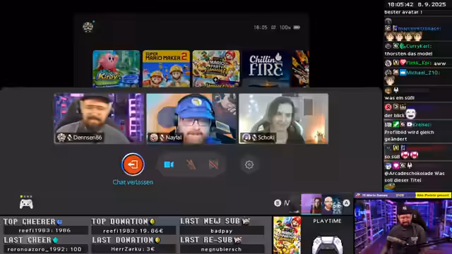 02:18:42Die Nintendo-Kamera ist gut positioniert und hat einen Weitwinkel. Der Hund wird in die Kamera gehalten. Neyfall hat eine Mütze auf und cosplayt. Volt ist im Voice-Chat und es wird gehofft, dass es Glück bringt. Neyfall ist immersiv verkleidet. Beut soll geaddet werden. Die Switch-ID wird genannt. Volt-Void hat keinen Cosplay an, könnte aber eine WoW-Cap aufziehen. Er wird gefragt, ob er wegen des Affen so benannt ist. Volt-Void wird eingeladen, aber es funktioniert nicht. Der Voice Chat muss neu geöffnet werden, da man niemanden hinzufügen kann. Es wird auf Nintendo geschoben. Die Joy-Cons werden gemutet.