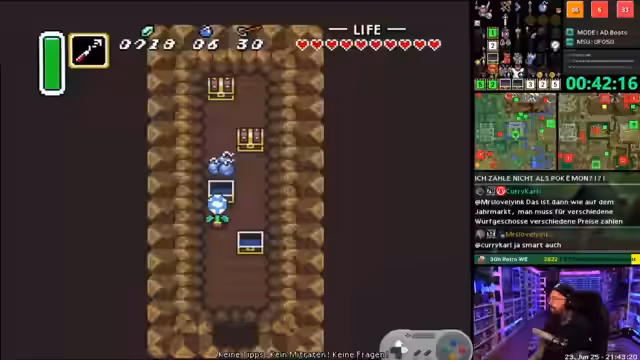 00:42:40Der Stream konzentriert sich auf das Spielen von *The Legend of Zelda: Breath of the Wild*. Der Streamer erkundet die Wüste, sammelt Crocs (kleine, versteckte Sammlerstücke) und löst Quests. Er stößt dabei auf einen Blutmond, eine besondere Nacht im Spiel, in der Monster neu erscheinen. Außerdem erwähnt er kurz, dass er eine Stunde *Mario Kart World* spielen wird, um das Spiel vor einem späteren Multiplayer-Slot auszuprobieren.