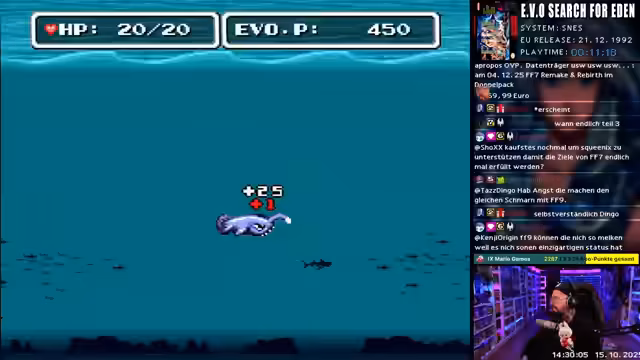 04:06:46Der Streamer betritt den finalen Dungeon und durchläuft die letzten Storysequenzen von Grandia 2. Nach der Besiegung des finalen Bosses Valmar wird ein Epilog gezeigt, der das Schicksal der Charaktere nach den Ereignissen beleuchtet. Während Ryudo in die Welt reist, um seine Suche fortzusetzen, starten Elena und Millenia neue Lebensabschnitte. Im Anschluss bewertet der Streamer Grandia 2 trotz des negativen Endes sehr positiv und beginnt mit einem komplett neuen Spiel, E.V.O. Search for Eden. Er gibt einen ersten Einblick in das Prinzip des Spiels, bei dem man durch die Evolution von einem einfachen Lebewesen zu komplexeren Formen fortschreitet, und beginnt mit der Erkundung der ersten Zone.