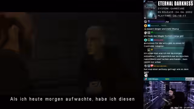 01:14:03Nachdem die Einkaufsliste für die Retro-Börse feststeht, wechselt der Streamer zu einem Spiel. Er startet Eternal Darkness für den Nintendo Gamecube. Er ist im Menü und sucht nach dem Fortschritt aus der letzten Stream-Session. Er beendet den aktuellen Story-Abschnitt mit Paul, einem Mönch im 13. Jahrhundert, und sammelt das Herz von Mantorok, um im nächsten Kapitel weiterzukommen. Das Gameplay wird mit Kommentaren zur düsteren Atmosphäre und den Storyelementen begleitet.