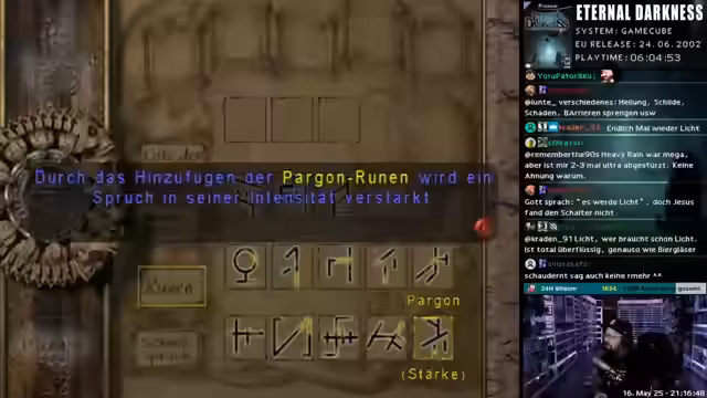 02:45:09Nach der Erkenntnis, dass Verstärkungsrunen Sprüche intensivieren können, wechselt der Fokus auf persönliche Themen wie sein "verändertes Waschgame" und Anekdoten aus der Handy-Ära. Später vergleicht er Eternal Darkness mit anderen Spielen wie Super Mario 64 und Apex Legends, wobei er Letzteren als "Größten Schmutz aller Zeiten" tituliert und seine Erwartungen an die Nintendo Switch 2 teilt. Diese Abschnitte dienen als Pausenfüller und Unterhaltung für das Publikum.