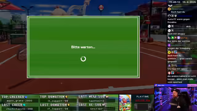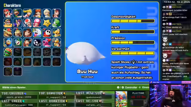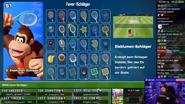 00:50:20Die Konzentration liegt auf dem Ranked-Modus in Mario Tennis Aces. Der Streamer experimentiert mit verschiedenen Charakteren wie Waluigi, Donkey Kong und Rosalina, die er mit unterschiedlichen Schlägern kombiniert. Er analysiert deren Stärken und Schwächen und diskutiert intensiv mit dem Chat über die aktuelle Meta, wobei Charaktere wie Rosalina mit dem Schiebe-Max-Schläger als extrem stark gelten.