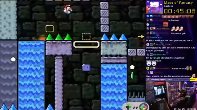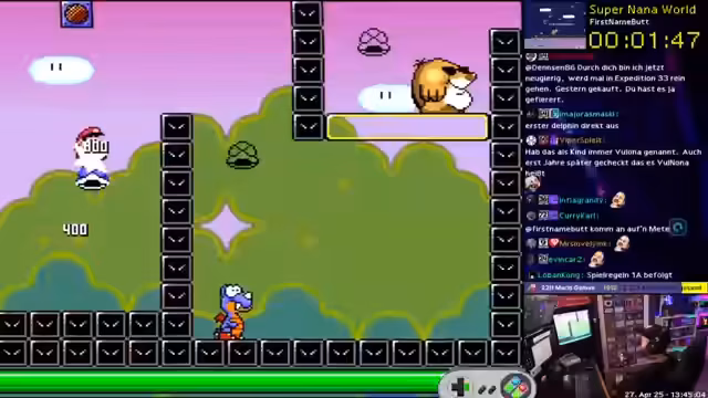 00:36:31Nach dem Ratequiz beginnt der Streamer mit dem Spielen von Super Mario World Hacks. Zuerst wird der Hack 'Made of Fantasy' von Saphros gestartet. Der Streamer testet verschiedene Level, nutzt diverse Mechaniken wie Yoshi und Shell-Jumps und gibt dazu Kommentare zur Levelgestaltung und Mechanik. Es folgt der Test weiterer Hacks wie 'You Have No Life' und 'Nanoworld'.