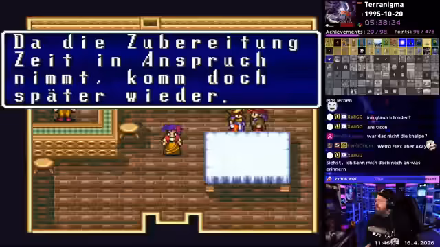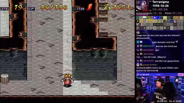 00:00:00Der Stream startet mit dem Spiel Terranigma, in dem der Spieler sich zunächst mit der Jagd nach Wolfsfleisch für eine Quest beschäftigt. Der Streamer zeigt große Verwirrung über die Game Mechanik, insbesondere über die Anzahl benötigter Wolfsfleischstücke und die Schwierigkeit, dies zu beschaffen. Es folgen erste Probleme mit dem Spielverlauf und technischen Unstimmigkeiten, wobei der Streamer gelegentlich frustriert auf Situationen reagiert.