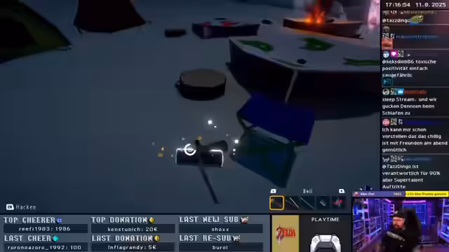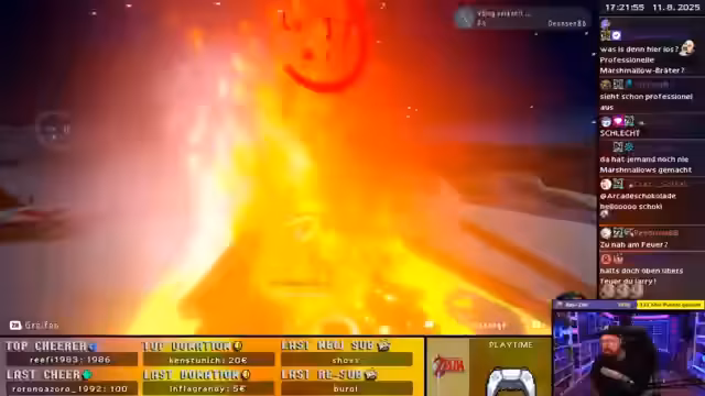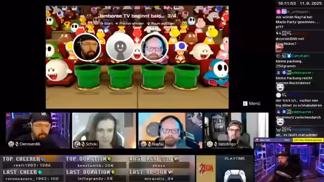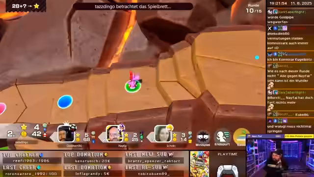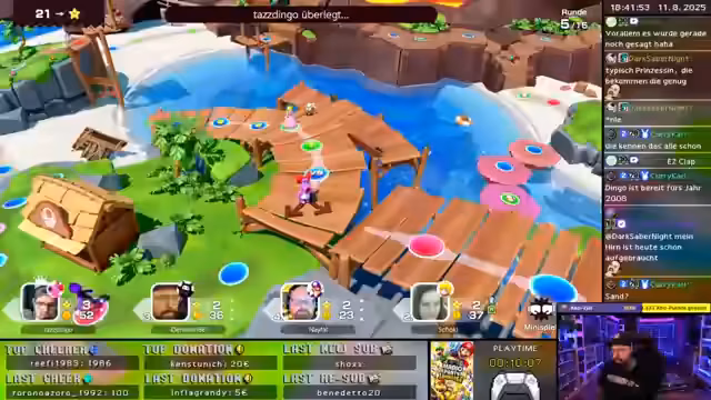 00:00:11Der Streamer startet in die Runde und erwähnt, dass die Zuschauer am Abend erneut zu einer Mario Party Session eingeladen sind. Er beschwert sich über die Piss-Konsole, die niedrige FPS und Probleme mit dem Controller, der sich leerlaufen kann. Bei einem Minispiel, das auf zurückgelegten Feldern basiert, gibt es knappe Abstände und der Streamer holt sich nur den Bu, den letzten Platz. Es werden viele genervte Reaktionen auf die Performance und das Spielgefühl geäußert.
