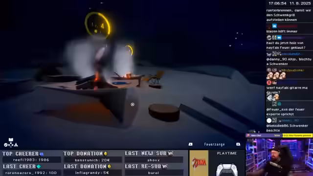 00:44:18Das Hauptevent des Abends ist der Mehrspieler-Titel Chillin by the Fire. Der Streamer lädt Nefal zu einem gemeinsamen Session ein, was die einzigen beiden Teilnehmer sind. Das Spiel erweist sich als anspruchsvoll und stressig, anstatt wie angedacht chillig. Ziel ist es, das größte Feuer am schnellsten aufzubauen, was das Sammeln, Schneiden und Anzünden von Holz erfordert. Beide Spieler kämpfen mit der Steuerung und den unvorhersehbaren Effekten wie Regen und Rauch.