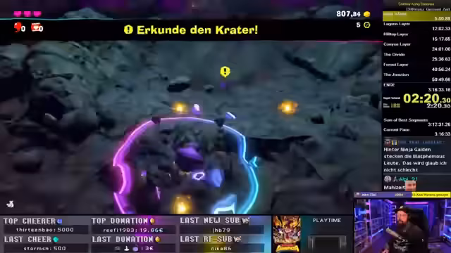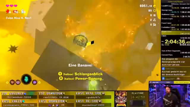 00:29:28Nach der Pause wird der DK Bananza Run fortgesetzt. Der Streamer hat deutlich Fortschritte beim Lernen der Routinen und Strukturen der einzelnen Splits, insbesondere bei den sogenannten 'Radiance Layers'. Dennoch bleibt das Spiel eine große Herausforderung, vor allem durch die sehr bosshaft gestalteten Bosskämpfe und die unübersichtlichen Levellayouts, die oft viel Zeit durch falsche Wege oder Orientierungslosigkeit kosten. Das Ziel bleibt eine Zeit unter zwei Stunden.