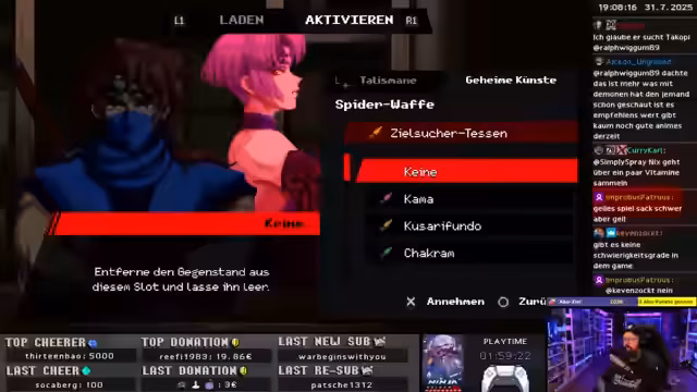 05:09:46Der Streamer trifft auf eine Black Spider-Ninjadie anfangs feindlich gesinnt ist. Nach dem Kampf schließen sich beide Charaktere zusammen, um den Dämonenfürsten zu stoppen. Sie verwischen die Grenzen zwischen Gut und Böse. Dies spiegelt sich auch in den Fähigkeiten wider, die sie nun teilen, wie dem Sphären-Heilungseffekt.