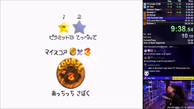 00:00:00Der Stream beginnt mit technischen Problemen an der Konsole, die bei jedem Spielende nachfragt, obwohl die Stufenauswahl ohnehin angezeigt wird. Dies führt zu Frustration beim Streamer. Außerdem wird über die Größe der PlayStation gesprochen, die der Streamer als "Klotz" bezeichnet und im Gegensatz zur Slim-Variante als schwer empfindet. Später gibt es auch Probleme mit dem Autosplitter-Tool für die Mario 64-Läufe, das nicht richtig funktioniert und Einstellungen überschreibt.