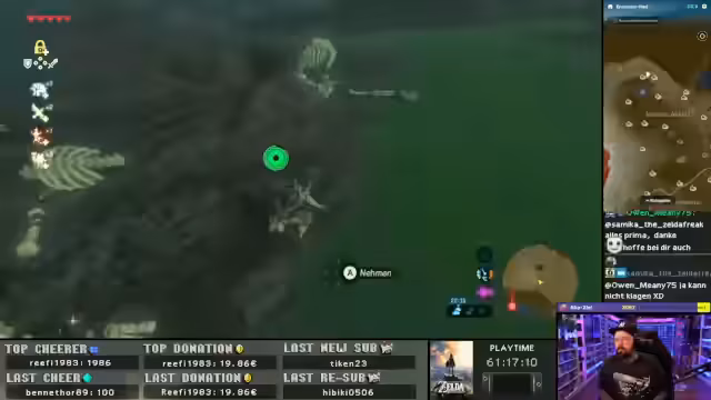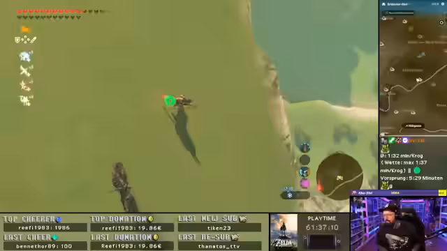 03:52:49Der Streamer konzentriert sich darauf, die verbleibenden vier Krog-Objekte im Norden von Hyrule zu sammeln. Nachdem er feststellt, dass der Zugang zu einem Schrein blockiert ist, plant er, die Gegenstände vom nahegelegenen Turm aus zu holen. Gleichzeitig äußert er sich zum geplanten Zelda-Race und erwähnt, dass er nach zweieinhalb Stunden Breath of the Wild den Wechsel zum Spiel Zelda A Link to the Past Randomizer bevorzugt, um Überarbeitung zu vermeiden.